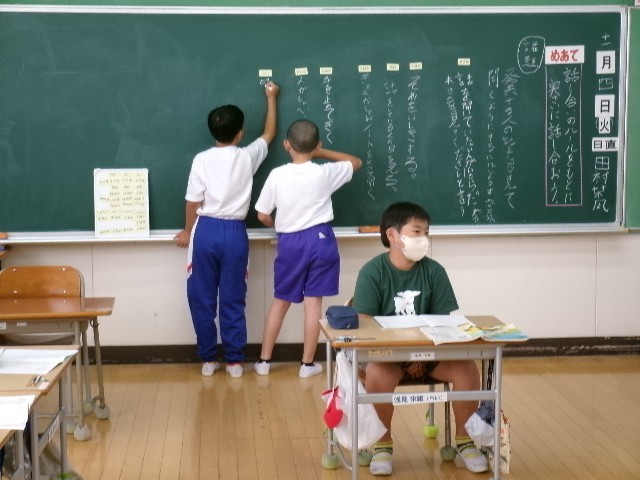 4年生は、話し合いのルールをもとに、実際に議題を決めて話し合う学習をしていました。