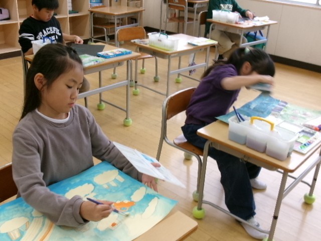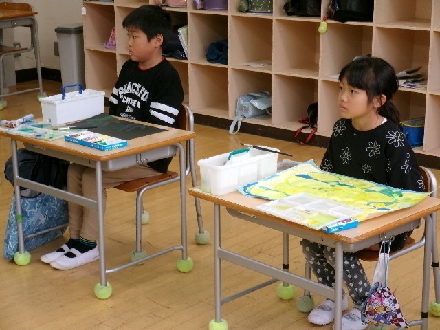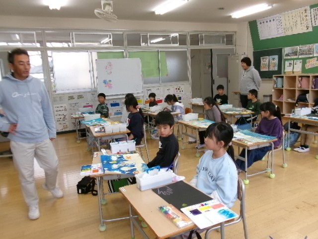 2、3年生は一緒に学ぶ学習室で、図工の学習をしていました。しっかり話を聞いて、集中して取り組んでいました。