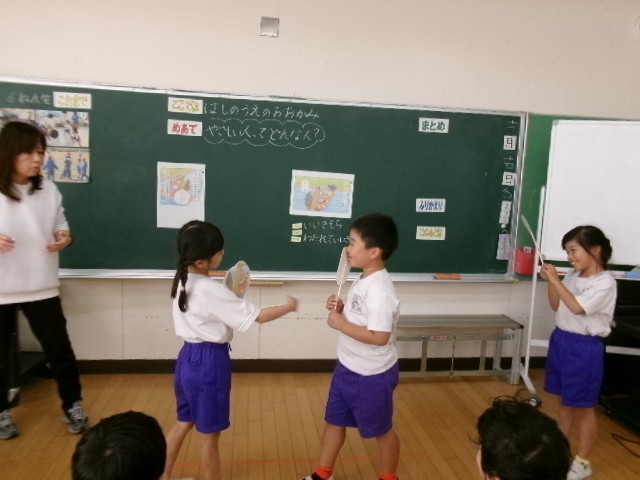 1年生は、道徳の学習をしていました。「これまで」に、6年生から運動会に向けてソーランを教えてもらったり、なかよし遠足で一緒に遊んだりしたことを思い出しながら、思いやりや親切について考えました。始めはいばっていたおおかみさんが、くまさんに会って優しくされたことを見習って同じように親切にしたことから、自分自身の生活で友達とどのように過ごしたいか考えました。