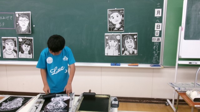 自分の顔の版画をすりました。よく特徴をとらえていて、誰がどの版画かすぐに分かりました。この力作を授業参観でご覧ください。