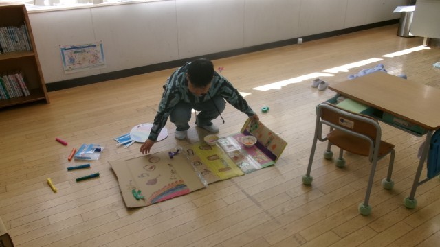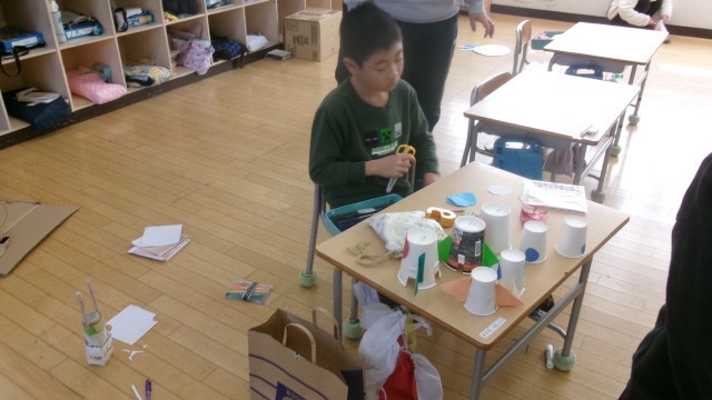 今日は生活科の「おもちゃらんど」の学習をしました。一人一人が想像したおもちゃを作成。来週の授業参観でお披露目するようです。