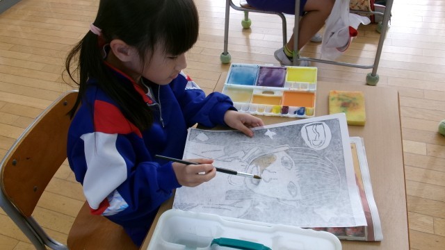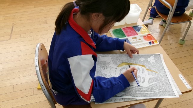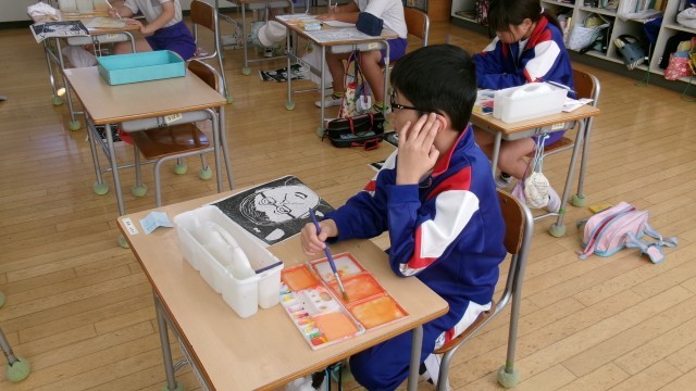 今日は版画で刷った絵に色塗りをしました。どの色か選定するのに悩んでいる児童が多かったです。でもその分良い作品に仕上がると思います。