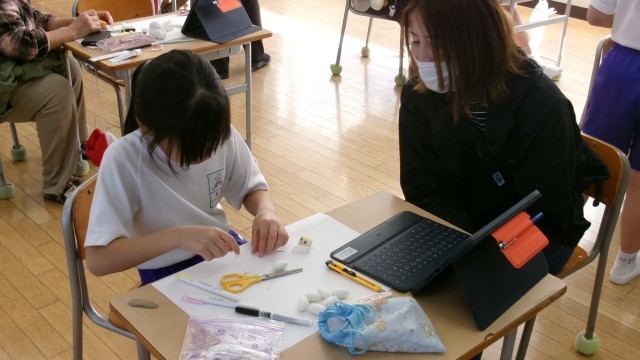 今日は3年生で育てたお蚕さんからとった繭を使って「まゆクラフト」を作成しました。親子で相談しながらかわいらしい作品を仕上げていました。自慢げに見せてくれる児童もいました。