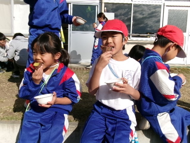 1、2年生は春に植えた苗から、さつまいもの実が大きくなったので「やきいもパーティー」をしました。春夏秋冬と草むしりをしたりお水を上げたりするなど、優しい気持ちで成長を願い世話をしてきました。休み時間には、他の学年の子どもたちも甘い匂いに誘われて、校庭に集まってきました。「どうぞ!」と声をかけ、大きな学年の子どもたちもみんなで「おいしい!」と、秋の味覚を味わいながら笑顔が輝いていました。