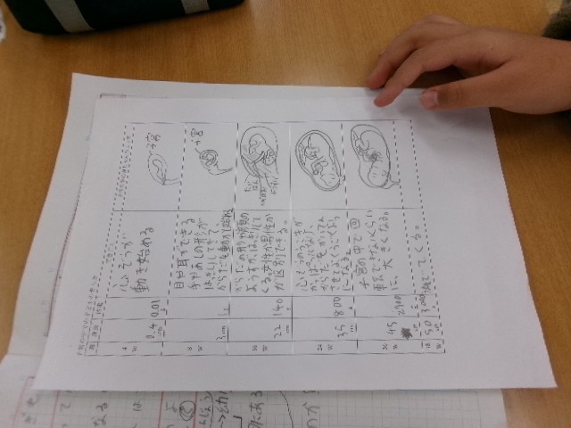 5年生は、赤ちゃんがどのように成長するのかを考える学習をしていました。羊水や胎盤、へその緒はどんな役割をしているのか、自分たちが疑問に思っていた課題を解決することが出来ました。「人類の最初は何からはじまったのだろう?」と、さらなる疑問を抱いていました。核やその他の膜に包まれた器官を持たない、現在の細菌や古細菌(アーキア)のような原核生物に似た単純な構造だったと推定されていて、分裂して数を増やしていたことを知りました。分裂するということはコピーなので進化がないことに驚いていました。雄や雌がいるということは、進化を続けることになると知ると「なるほど!」と、納得していました。