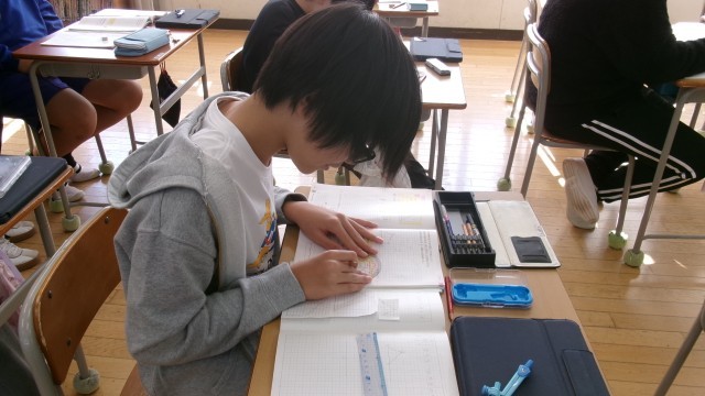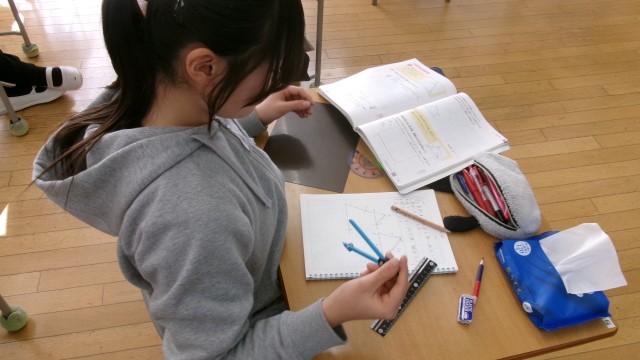 今日は三角形の拡大図と縮図にチャレンジしました。三角定規、コンパスを活用してノートにしっかり描くことができました。
