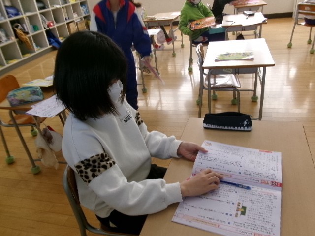 4年生は、冬休みの課題の確認をしていました。今日の宿題から始めていいことを伝えると、「早くやりたい!」「今日やるよ!」「クリスマスまでには終わらせるようにがんばる!」など、意欲的な言葉が飛び交っていました。