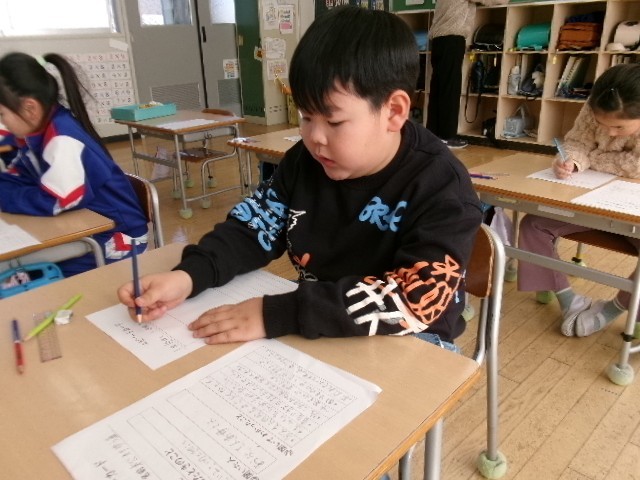 2年生は家族にインタビューしたことを元に、エピソードカードを書く学習をしていました。これまでに、生まれた時の様子や嬉しかった想いを家族から聞いたので、これからの学習で一人一人の本にまとめるのが楽しみです。