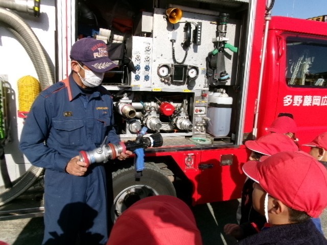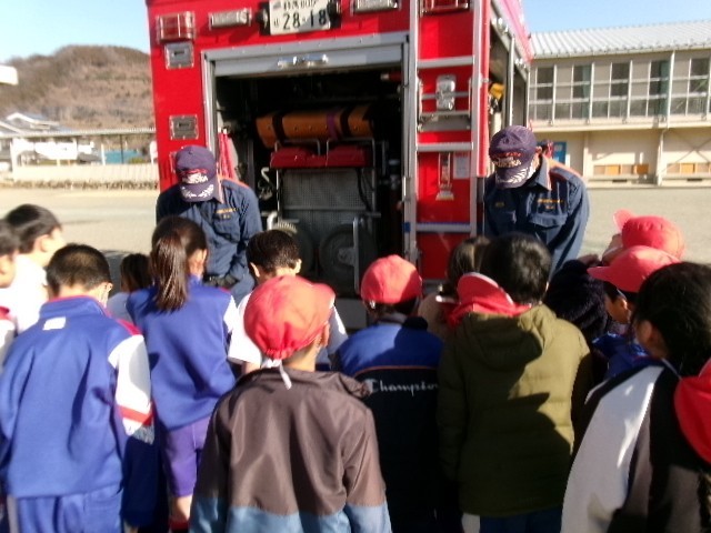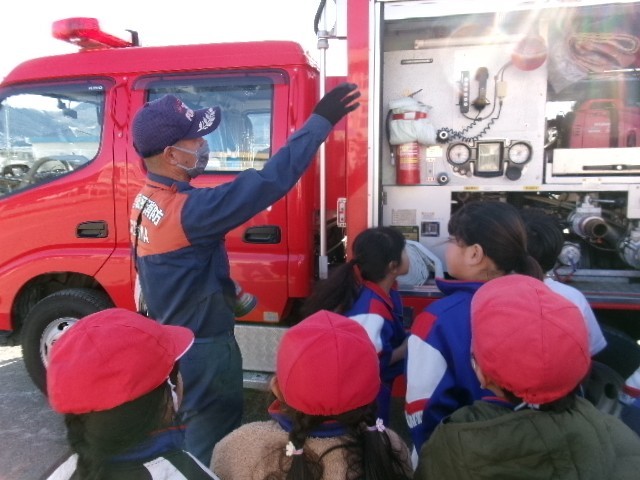 1、2年生は避難訓練の後、特別に消防自動車を近くで見させていただきました。「これは何ですか?」「何に使いますか?」など、みんな意欲的に質問していました。地域や私たちの安全をいつも見守ってくれている消防士さんと、たくさんお話ができてみんな笑顔でした。