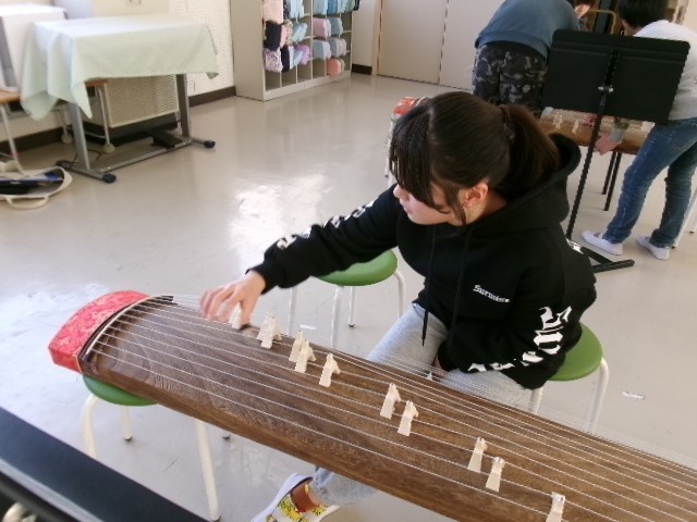 6年生は、琴の学習をしていました。友達と協力しながら、柱(じ)で弦を支えていました。5年生の時に学んだことを思い出しながら、「さくら」の演奏をしていました。