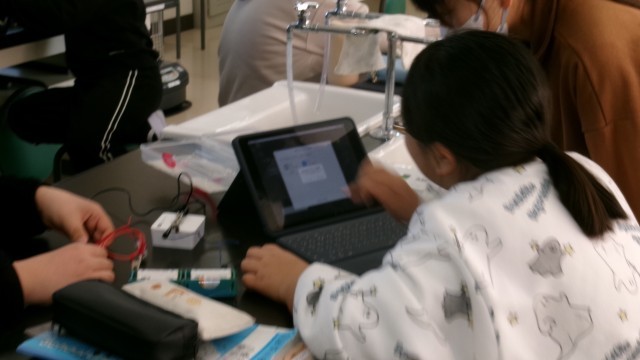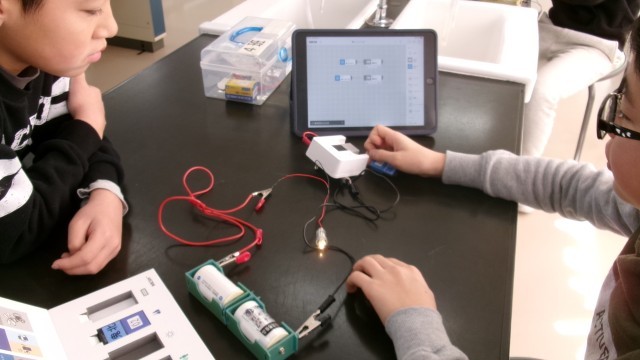今日のめあては「電流を節約するくふうを考えよう」でした。取り組んだのは、電気を付ける実験の中で、「暗いから電気をつける」「明るいから電気を消す」というのをセンサーを使って、制御するプログラムを実際にやってみることにしました。