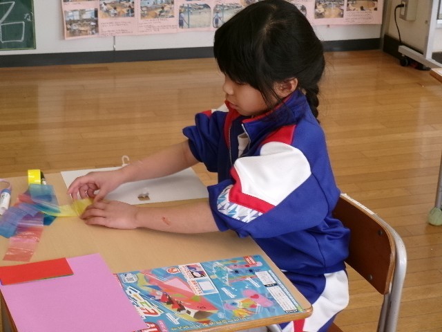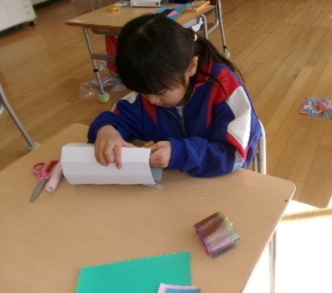 1年生は、糸を通して動かすおもちゃを作っていました。縦にしようか横にしようか、迷いながらオリジナルな作品を作ろうと意欲的に活動していました。