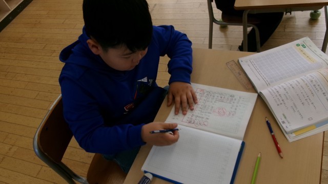 今日のめあては「大きな数の計算のしかたを説明しよう」でした。算数ですが、「まずは・・・する。次に・・・」などとしっかり説明する文を考えてノートに書きました。