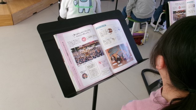 今日は「神田祭りのお囃子」で使われている太鼓や笛について学習しました。鬼石祭りと比較しながら、太鼓や笛の音色などを聞いて気づいたことを話しあいました。