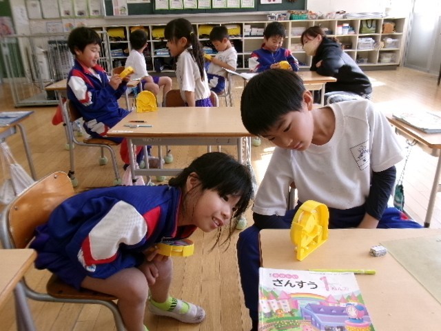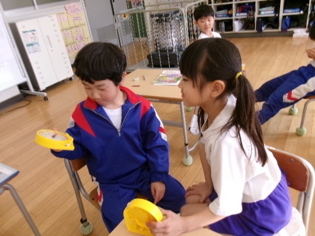 1年生はペアになって時計をよむ問題を出し合う学習をしていました。最後の問題を出し合うと、「楽しかった。」とつぶやいた児童もいました。授業の振り返りでは、