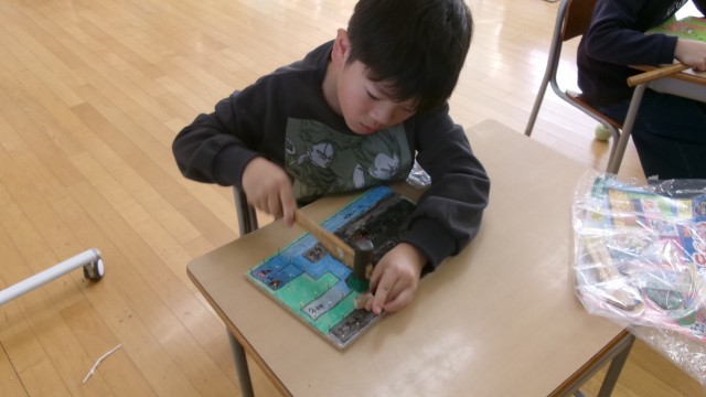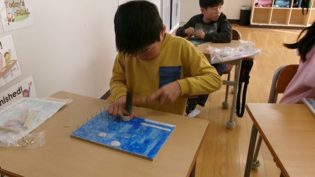 今日の図工は「くぎうちトントン」でした。学校中にトントン音が鳴り響いていたので教室を訪れると、慣れた手つきで釘を打つ3年生がいました。楽しそうに作業していました。