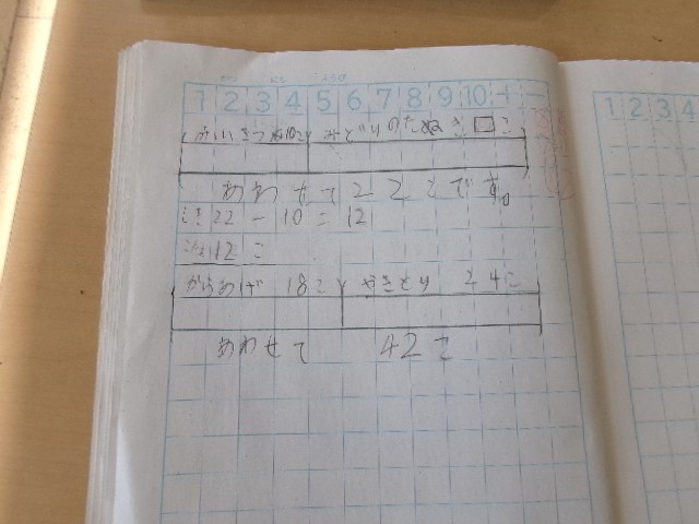 2年生は、たし算や引き算になる問題をテープ図に表していました。わかっている数も大きい数はテープ図を長くしたり、わからない数を□で表したりしていました。