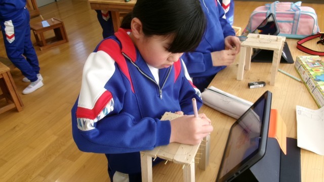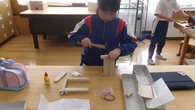 図工室に行くと釘を打ったり、ボンドで接着させたりする4年生がいました。写真立て、犬、池とカエル、台など様々なものを作成していました。仕上がりが楽しみです。