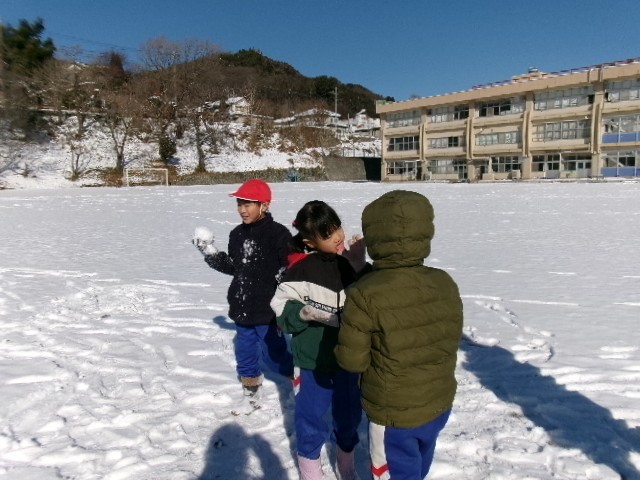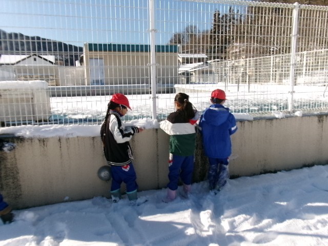 1年生は、雪の中を探検していました。「日なたと日陰の雪はどのように違うかな?」「こんな所につららがある!」「ここは雪が深いな。」など、たくさん発見していました。