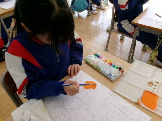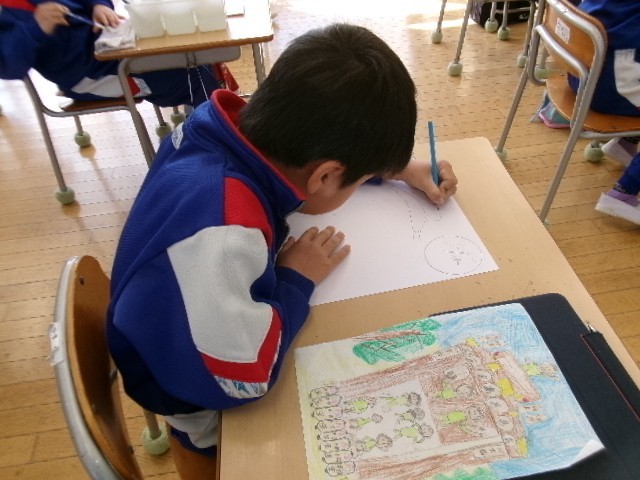 3年生は、「これまで」鬼石の町たんけんをして、鬼石のよい所について調べたり、まとめたりする活動をしてきました。「ここでは」下書きを見ながらカルタの絵札に色をぬっていました。