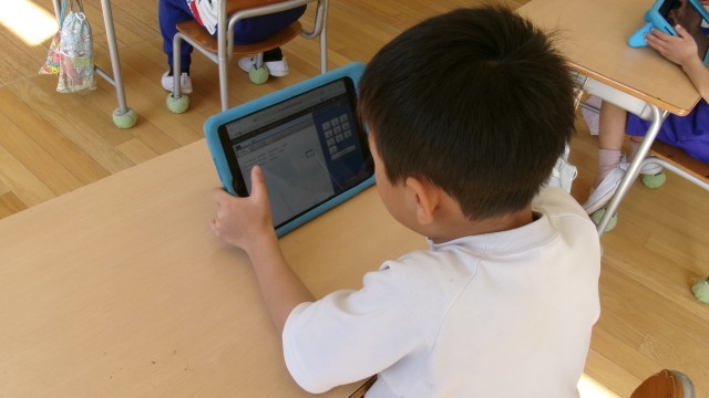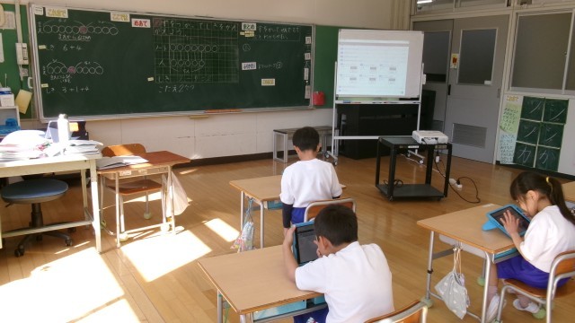 今日のめあては「ずをつかって しきをかんがえよう」でした。児童たちはすぐに理解し使い方も分かったようで、タブレットの問題にどんどんチャレンジしていました。