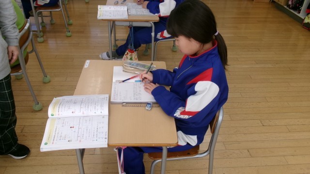 今日のめあては「帯分数を仮分数で表すにはどうするか考えよう」でした。児童はやり方をすぐに分かったようで、問題にどんどんチャレンジしていました。