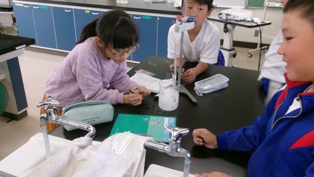 今日の学習は「水が凍るのは何度か」という実験をしました。氷に塩を加えることで氷の温度を下げることができることを利用したこの実験は、児童たちも興味津々。どのような変化が水にあるのか、釘付けでした。