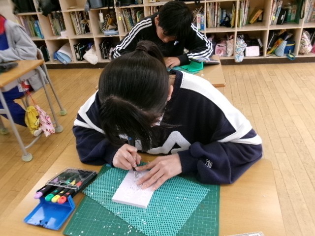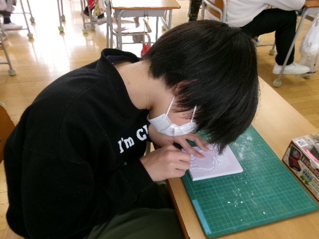6年生は、卒業制作に取り組んでいました。自分で気に入ったものを絵に描き、彫刻刀で丁寧に彫っていました。みんな集中して真剣な表情でした。仕上がりが楽しみです。