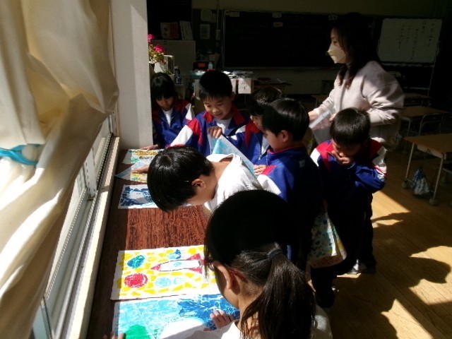 1年生は、初めての版画に挑戦し、今日は紙に刷りました。つくった版に水をつけると、「すりがみ」にきれいな色の模様が浮かび上がりました。1枚目を刷って、「もっと色があった方が楽しい!」と、2枚目を刷る前につけ加えた児童もいました。最後の振り返りでは、