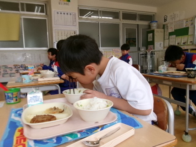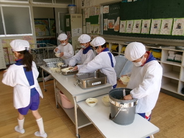 1年生は、全員で協力して給食の準備をしていました。一人一人自分の役割をてきぱきと取り組んでいました。ご飯やスープも上手によそれるようになって、成長を感じます。その後は給食をおいしくいただきました。好き嫌いをしないでもりもり食べていました。