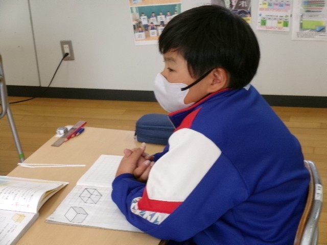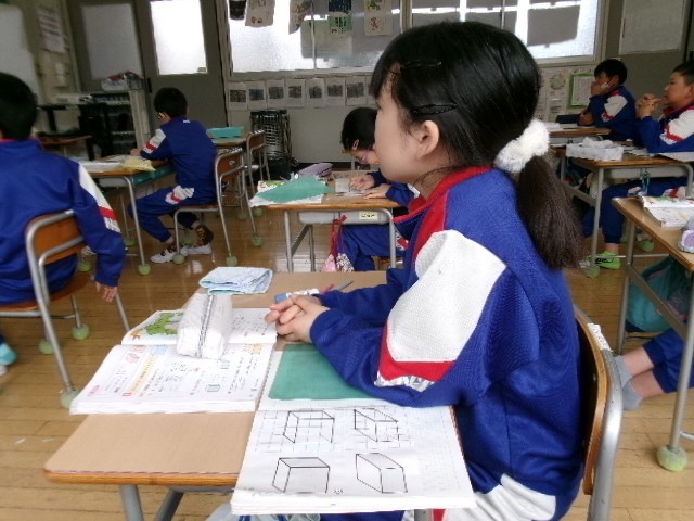 4年生は、直方体や立方体の見取り図を描く学習をしていました。直方体と似ている図形を見て、なぜ直方体ではないのか理由を、平面で学習したことを活用しながらしっかりと伝えていました。