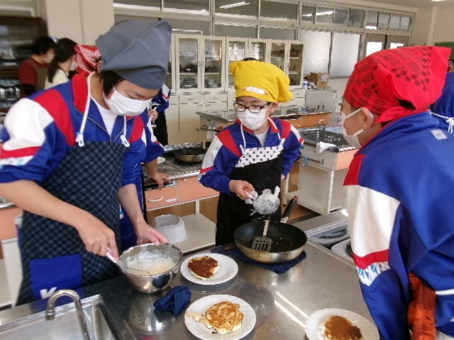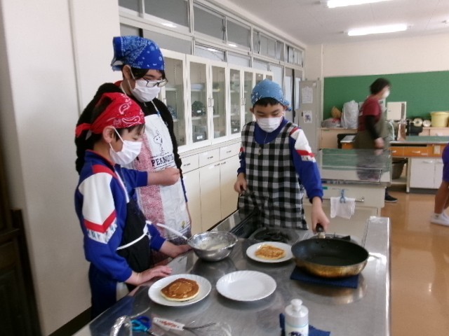 6年生は、お楽しみ調理実習でした。グループ毎に協力して、パンケーキを焼いていました。こんがりときれいな焼き目がついて、6年生も満足そうでした。