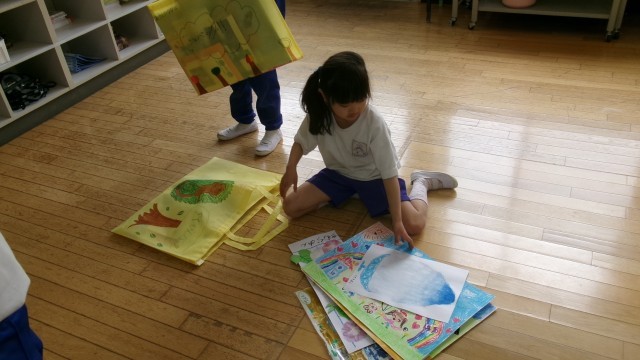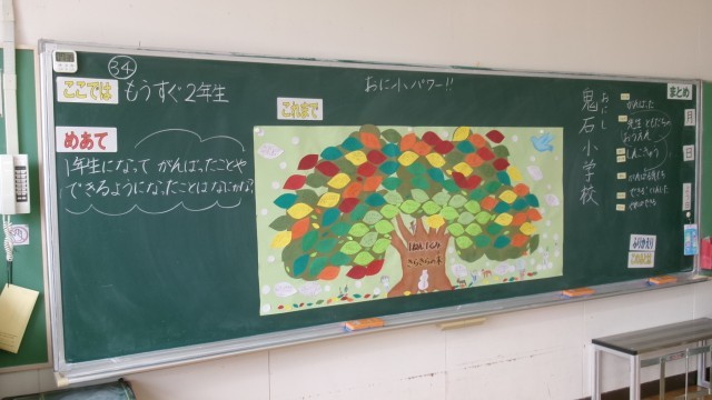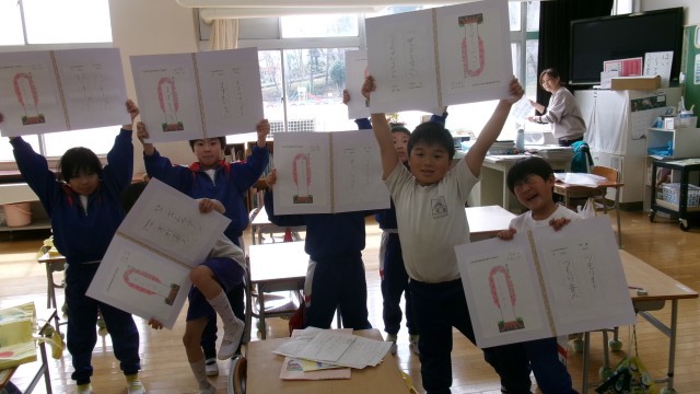 教室に入ると作品などを整理している1年生の姿がありました。1年間の成長を自分自身でしっかり振り返っていました。「校長先生、この字上手でしょ」と自慢げに話しかけてくれました。その姿にまた成長を感じました。