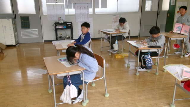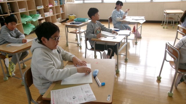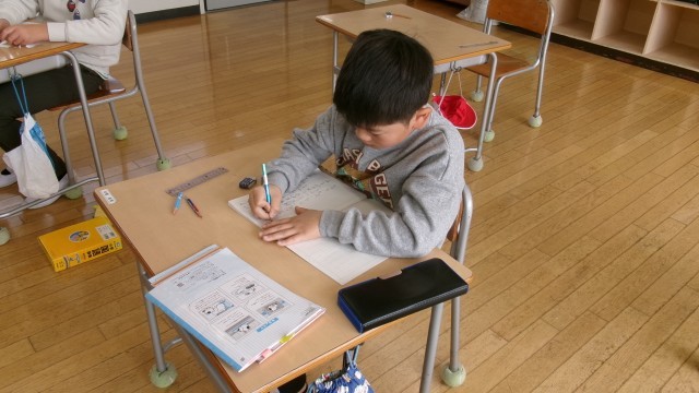 教室に入ると、「何書こうかな?」と悩んでいる3年生の姿がありました。課題は『来年頑張りたいこと』でした。「委員会、クラブを頑張りたい」「プールでもっと泳げるようになりたい」など、頑張りたいことはそれぞれ違いましたが、来年度にさらに成長したいと意欲満々に見えました。