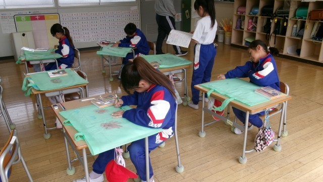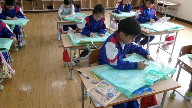 教室に入ると、作品バッグを仕上げる2年生の姿がありました。思い思いの絵を作品バックに書き込んでいました。