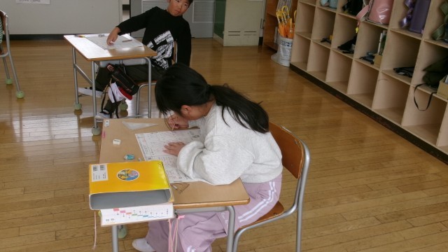 今日の算数は「1年のまとめ」として、算数プリントに挑戦していました。静かに黙々と問題を解こうとする姿は、4年生になる自覚の表れと思いました。