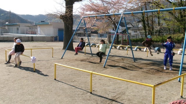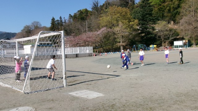 青空の広がるよい天気となりました。登校して教室での準備がすむと、鬼石小っ子たちは元気よく校庭で遊び始めます。学年問わず、みんなで楽しそうにサッカーをしたり、遊具で遊んだりしていました。