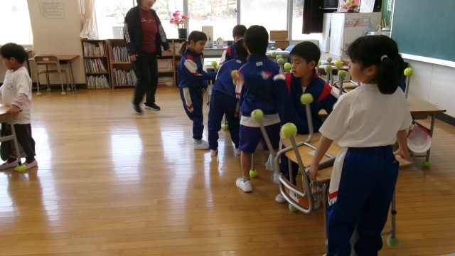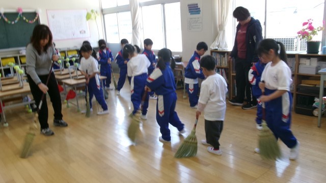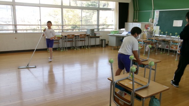 火・木・金の朝は「朝清掃」の時間があります。全員で校舎の隅々まできれいに掃除をします。早速、1年生も机を運んだり、先生のまねをしながらほうきで床を掃いたりしていました。何をするのもみんなとても楽しそうです。