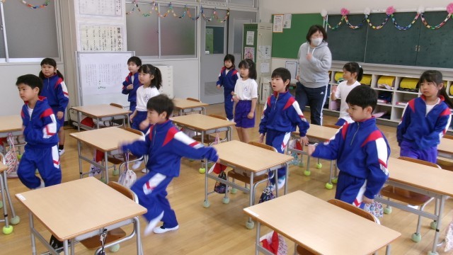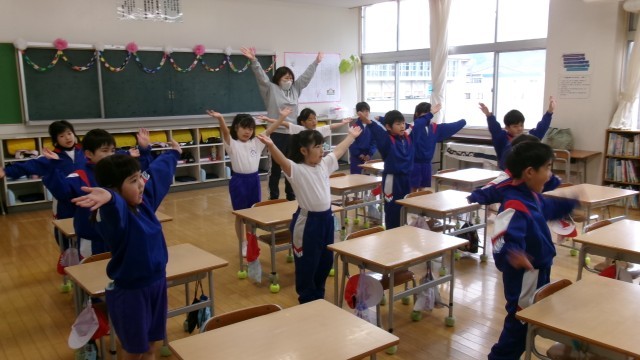 今度は1年生の教室からいい声が聞こえてきました。こちらは担任の先生が見本を見せながら、歌っていました。1年生も先生を見て真似しながら上手に動いています。きっとすぐに歌って踊れる鬼石小っ子になるでしょう。