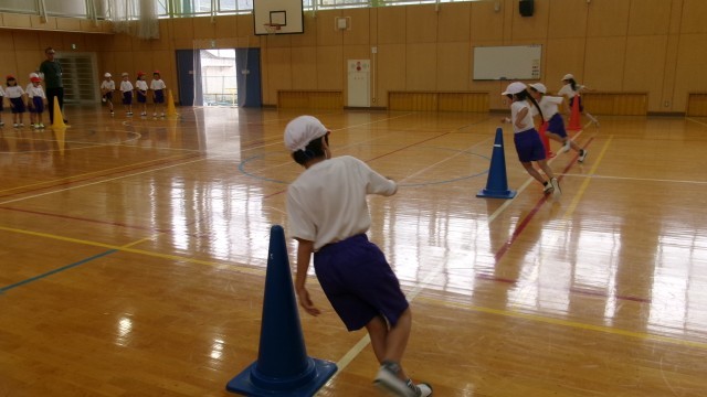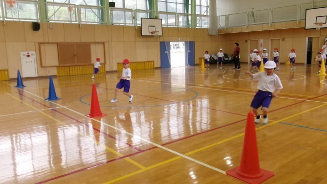 今日の体育では、走る練習をしました。4チームに分かれ、コーンに向かってまっすぐ走ります。最短距離を走ることが一番速く走れるということを教えてもらいましたが、できたかな?まっすぐ走るって意外に難しいようです。