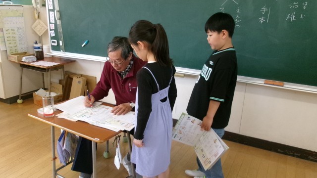 3年生以上の書写は地域の方が来て、指導してもらっています。どの子も一画一画、丁寧に集中して書き進めています。できたら見せに行きアドバイスをもらって、次に進んでいました。