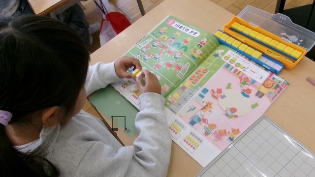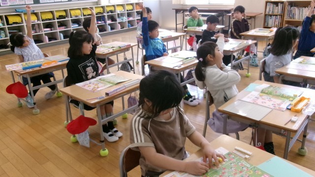 今日のめあては「なんびきいますか」です。教科書の中に「2ひき、3ひき、4ひき・・・」いる動物を見つけます。先生のお話をよく聞きながら、答えをどんどん見つけます。手を挙げてさされた後の答え方も上手になってきました。