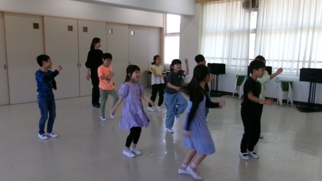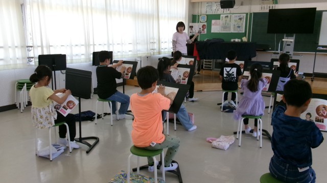 音楽室からとても元気な声が聞こえてきました。わらべ歌を歌ってから、次はさらに元気よく「さんぽ」を歌いながら踊りました。「とても歌声がいいね」と先生に褒められていました。それから教科書を使っての学習です。