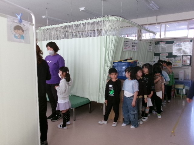 今日は眼科検診があり、1年生と4年生が診察していただきました。眼科検診は、楽しく勉強や運動に挑戦するために、自分では気付かない目の病気をチェックする大切な健康診断です。4年生はもちろん、1年生も静かに順番を待って診察を受けることができ、とても立派でした!