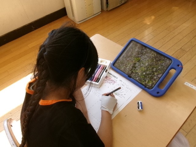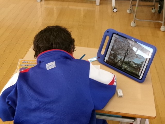 「春探し」ということで、サクラやドウダンツツジなどの写真を見ながら、絵を描いたり、気付いたこと書き留めたりしていました。子どもたちは、タブレット上の映像を拡大しながら、「サクラの花はピンクだけど真ん中の部分は少し赤い」「ドウダンツツジは鈴みたいな形」など、細かいところまで観察することができました。すてきな春を見つけられましたね!