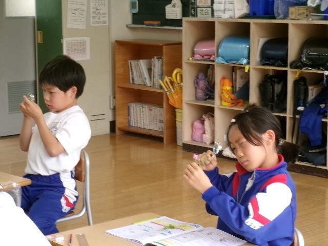 春の生き物がどのような姿をしているのかを調べるために、今日は、虫眼鏡の使い方について学習していました。先生の説明を聞いた後、実際に自分が採取した植物をじっくり観察してみました。虫眼鏡を使うと、おしべとめしべがはっきり見えるなど、細かいところまで観察することができ、驚きの声があがっていました。虫眼鏡を正しく、上手に使って、これからたくさんの生き物を観察していきましょう!