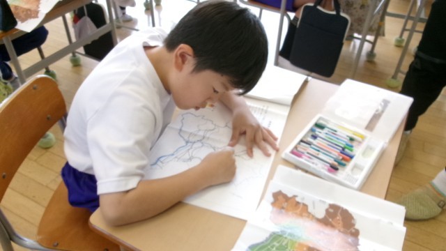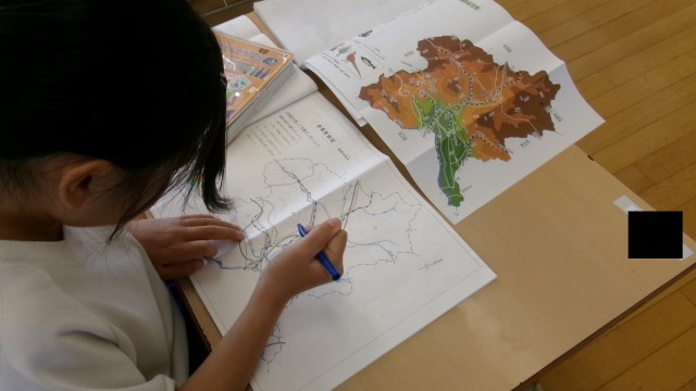 群馬県の白地図を使って学習しています。川がどこを流れているのか、鉄道や大きな道路・高速道路などがどんなふうに群馬県を通っているのかが少し分かったようです。鬼石を流れる神流川にもしっかり色を付け、群馬県の端を流れていることを確認することもできました。