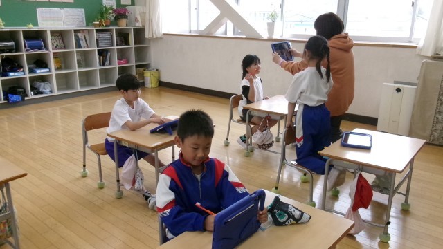 顔とにじの絵を描いたその次は「むし歯ポスター」に挑戦です。今日は最初に歯磨きをしている自分の顔の写真をタブレットで撮りました。ポーズを取って「ハイ、チーズ!」