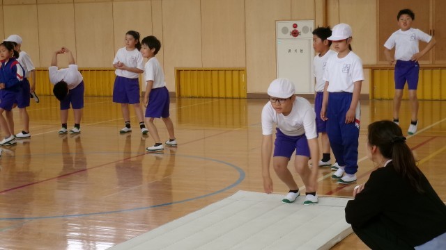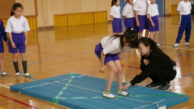 「立ち幅跳び」に挑戦です。やり方の説明を聞き、どうやったらたくさん跳べるのかを考えました。それから学年に分かれて遠くに向かって跳び始めました。次回は計測をする予定です。