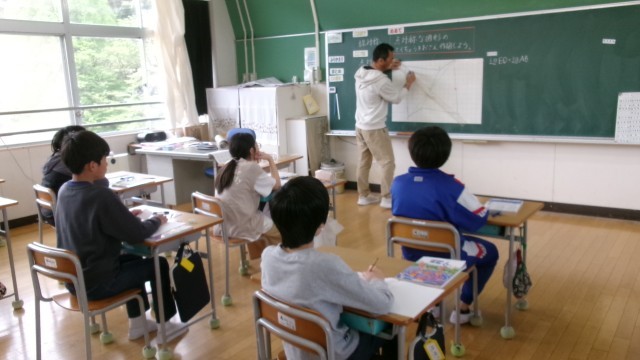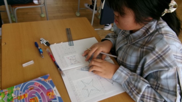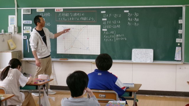 「線対称」の復習をしてから「点対称」に入りました。線対称の時にやったように点対称の図形を見て特徴をさがしました。編の長さや角度が同じだったり、同じ角をつなげると中心点Oで線が交わることに気づきました。